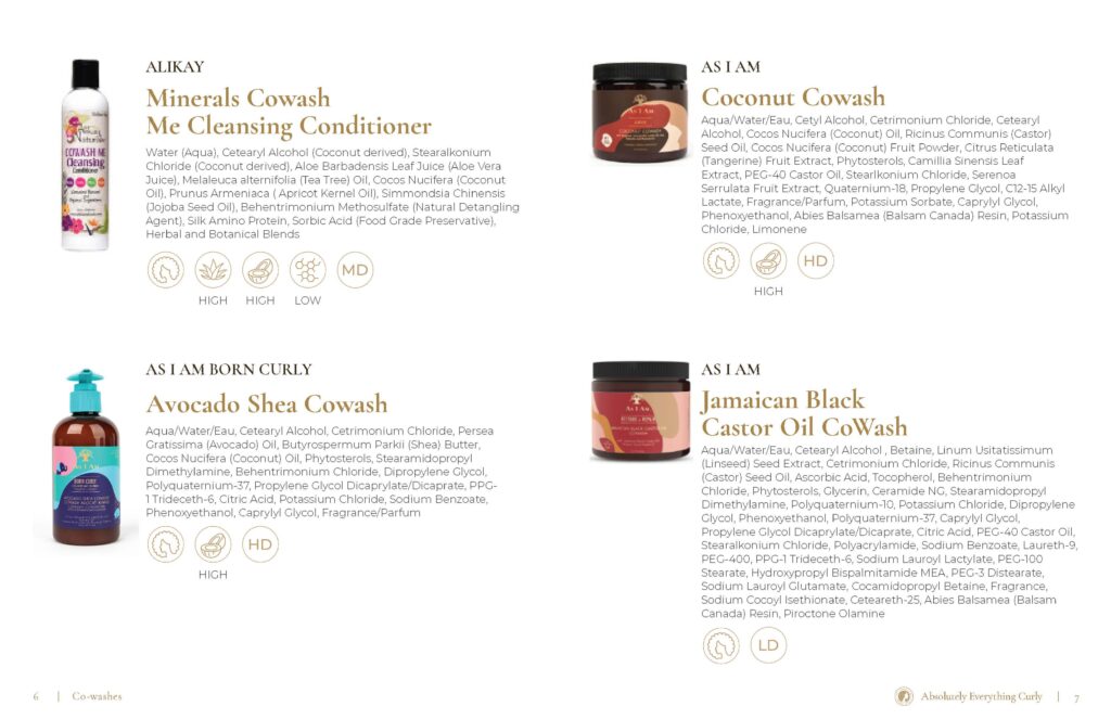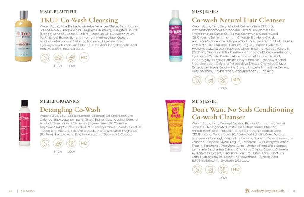 This Ultimate Guide features over 50 co-washes on the market today. Each product is marked for glycerin, coconut, protein, or aloe. We have also indicated whether a product is best for thin, low density hair (LD) or thick, high density (HD) hair (or both).